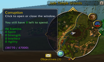 You can access the Corruption panel from your minimap. Your current stats will be displayed within the tooltip for easy access. It will also show your current experience and how much is needed to level up.